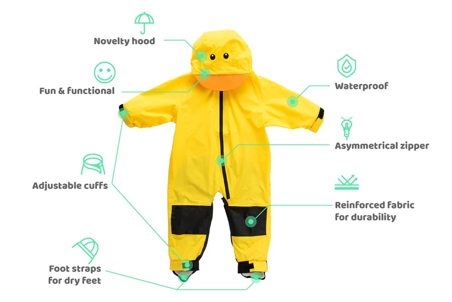 Rain or shine, let the fun continue with the Cuddle Club Kid's Novelty Hooded Rain Suit! This one-piece rainsuit is completely waterproof and breathable, providing your toddler with protection while playing in the rain, mud, or snow.